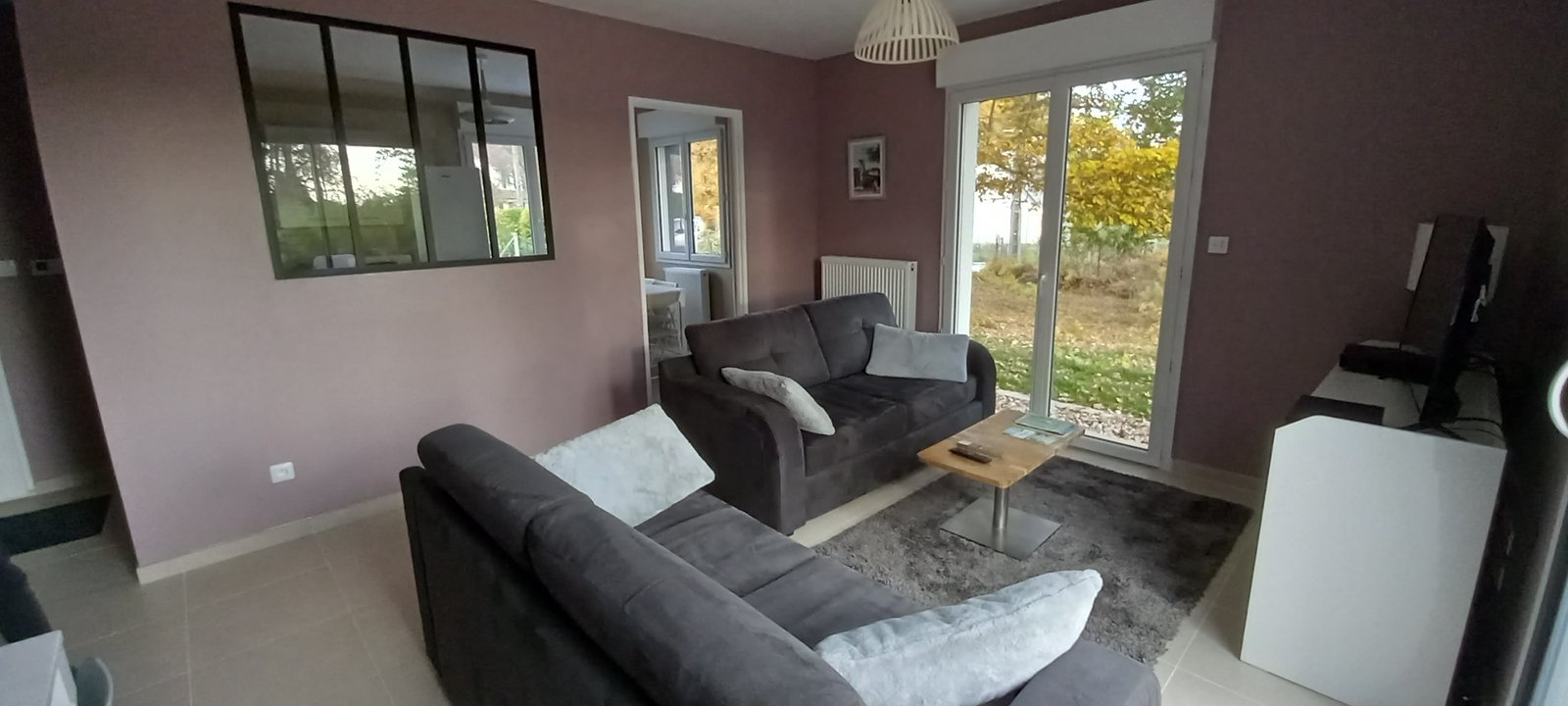 Séjour avec coin tv et partie salle à manger / espace de travail. Jeux et livres à disposition. L’orientation au sud donne sur la terrasse.